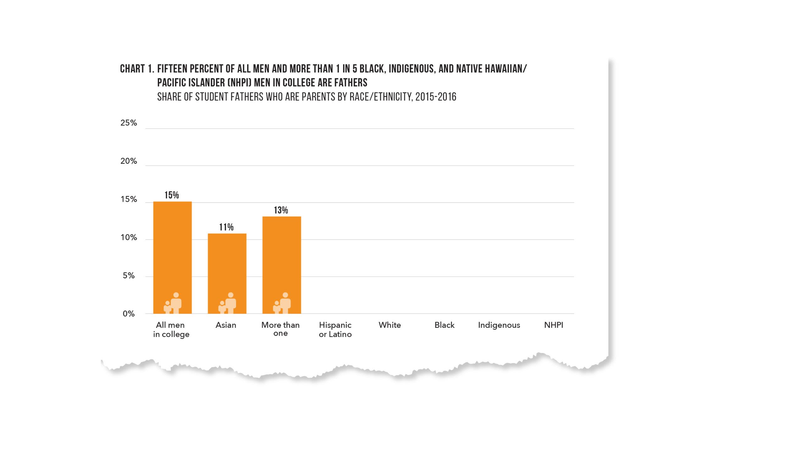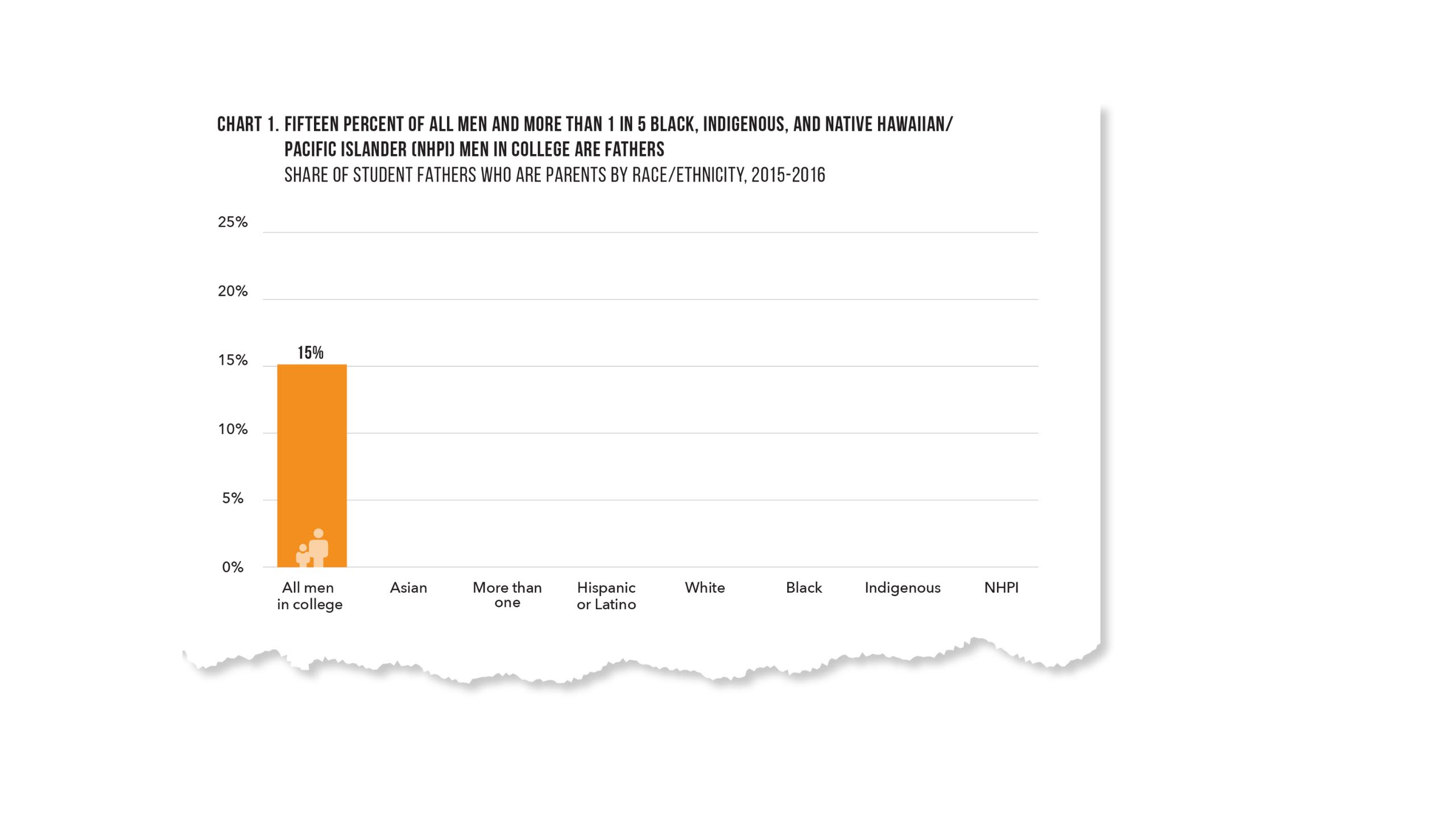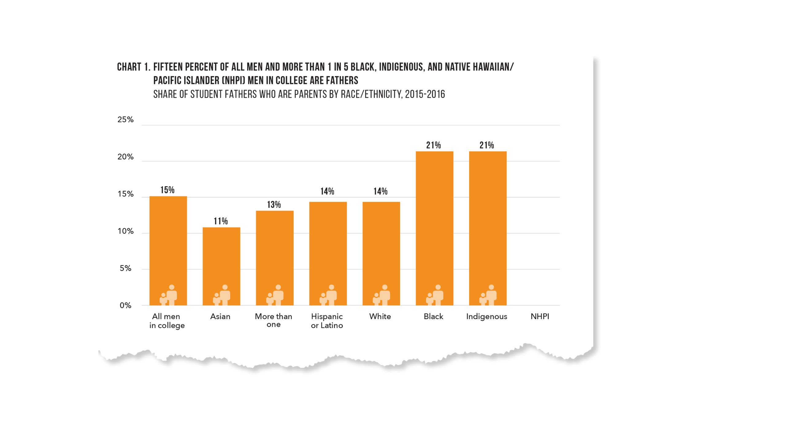 Analysis of data from the National Postsecondary Student Aid Study shows that 15 percent of all men enrolled in college are fathers, with higher rates of fatherhood among Black, Native American, and Native Hawaiian/Pacific Islander students (21 percent, 21 percent, and 23 percent, respectively) (Chart 1).