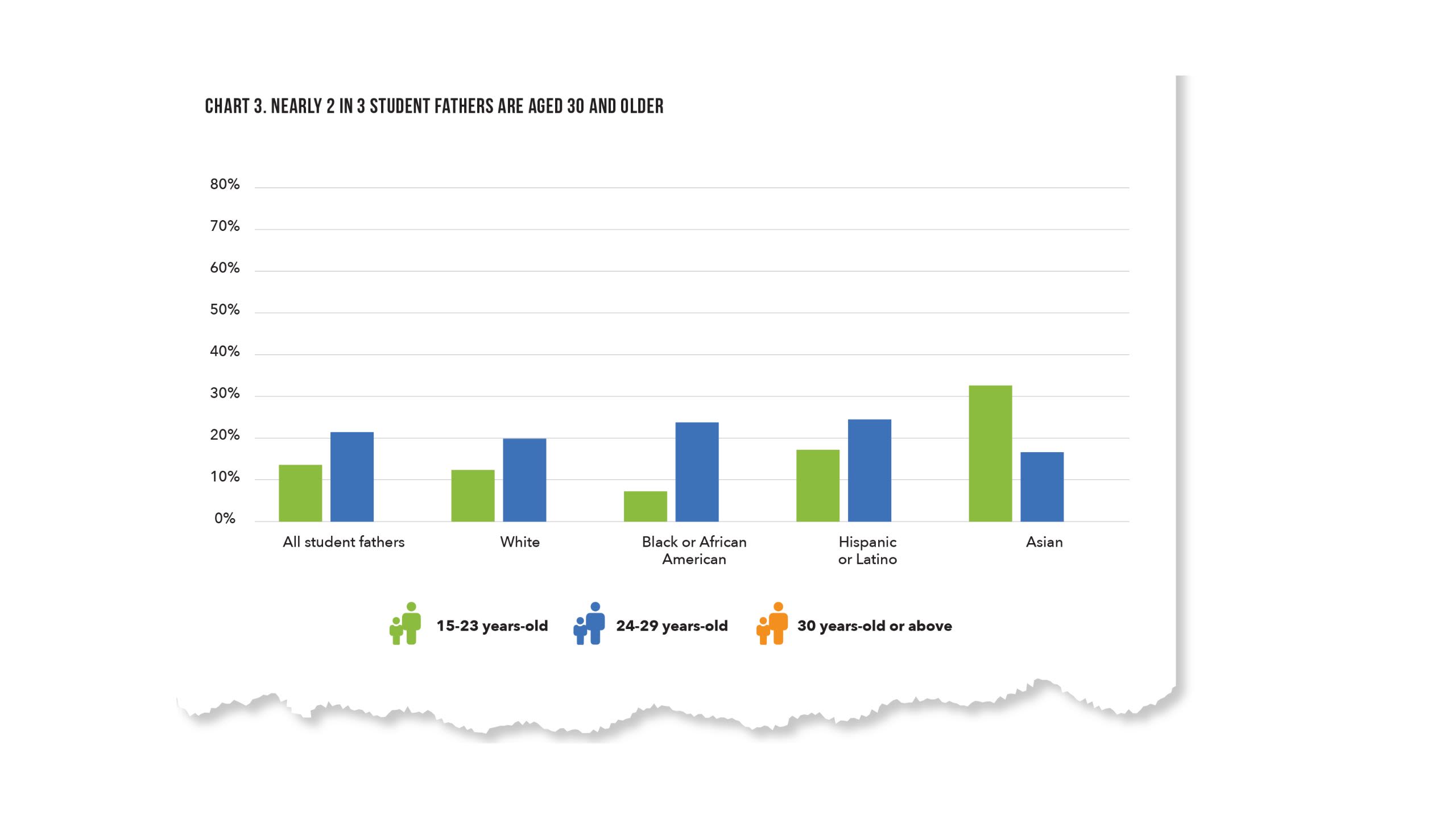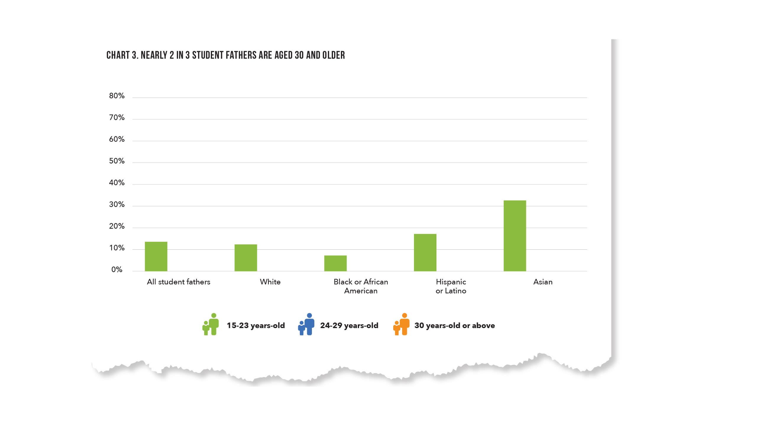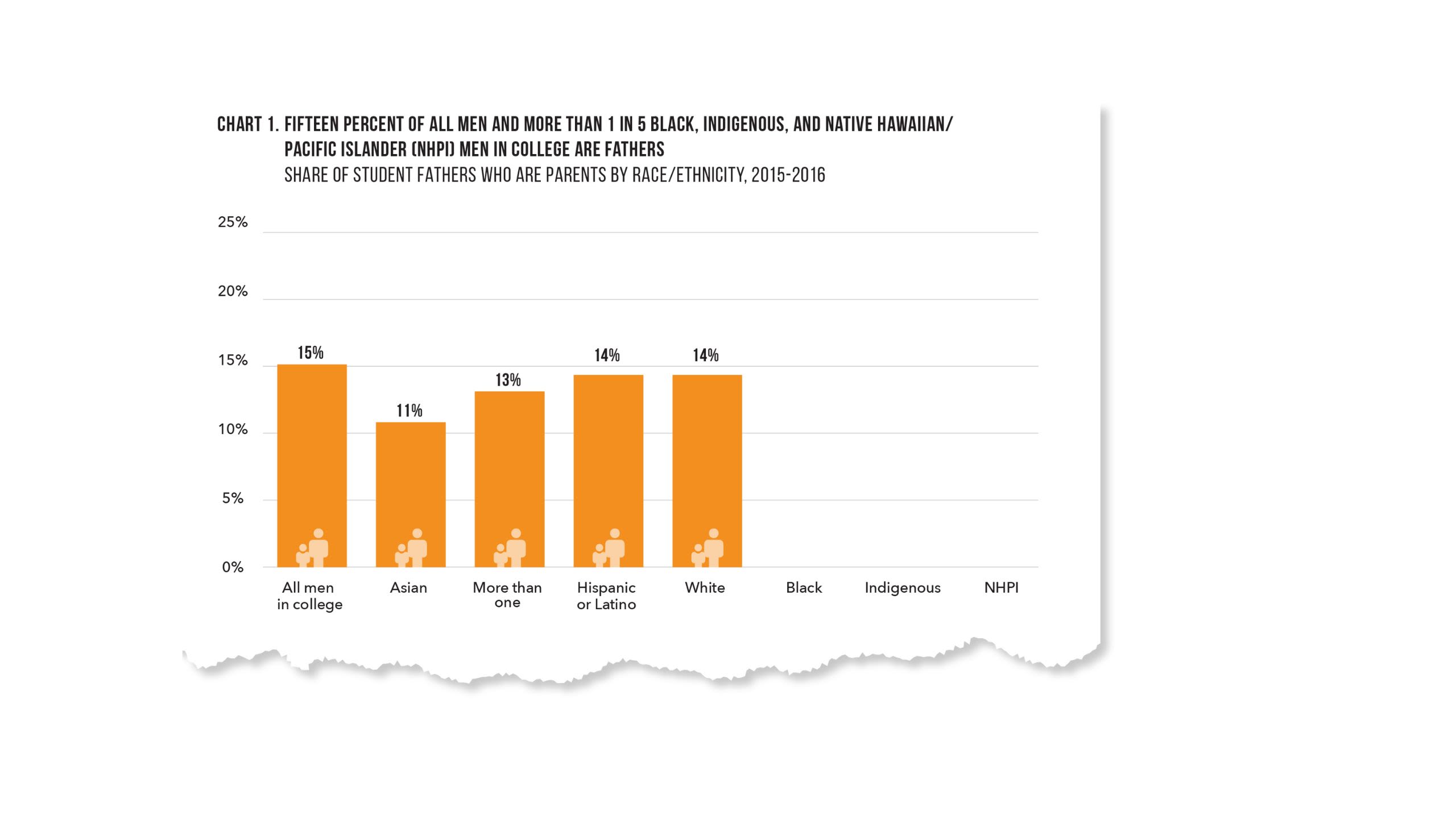 Analysis of data from the National Postsecondary Student Aid Study shows that 15 percent of all men enrolled in college are fathers, with higher rates of fatherhood among Black, Native American, and Native Hawaiian/Pacific Islander students (21 percent, 21 percent, and 23 percent, respectively) (Chart 1).